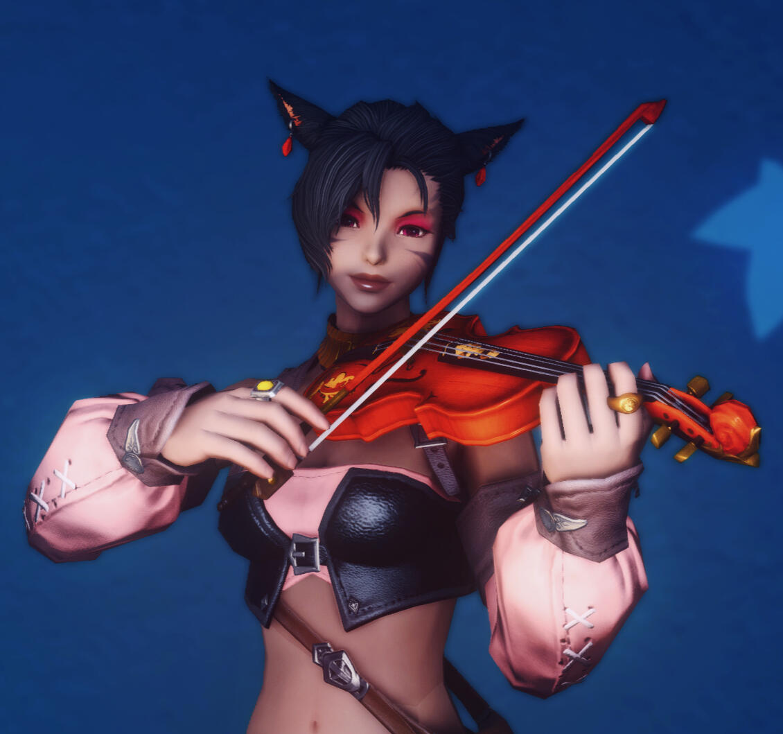 This dark-skinned Moonie miqo'te is an accomplished violin and harp player, often assisting other band members with the most difficult pieces.And do not believe her if she tells you that cat-gut strings are made from naughty miqos!